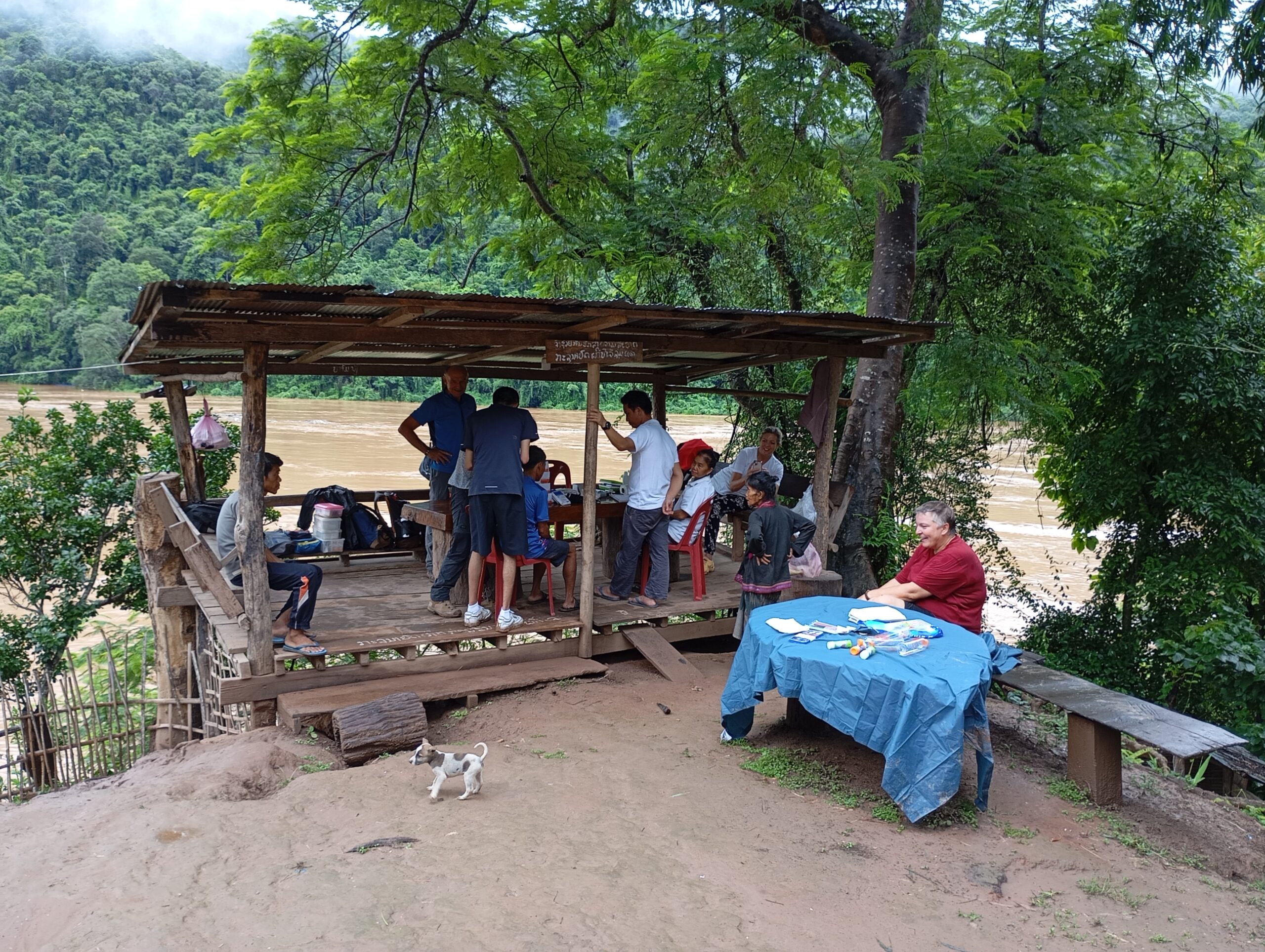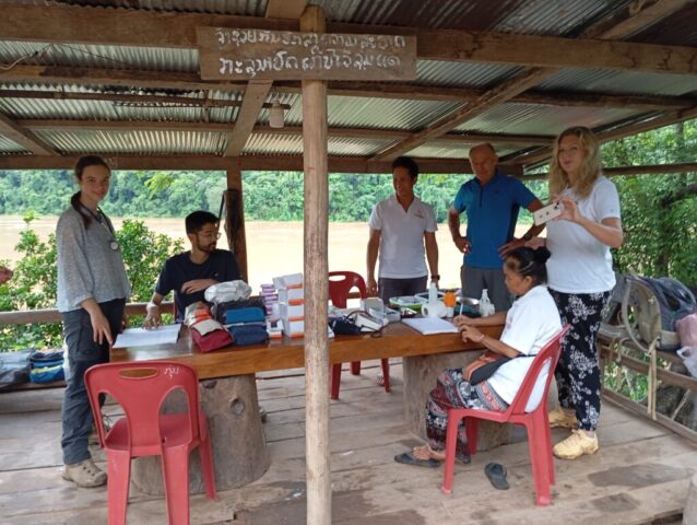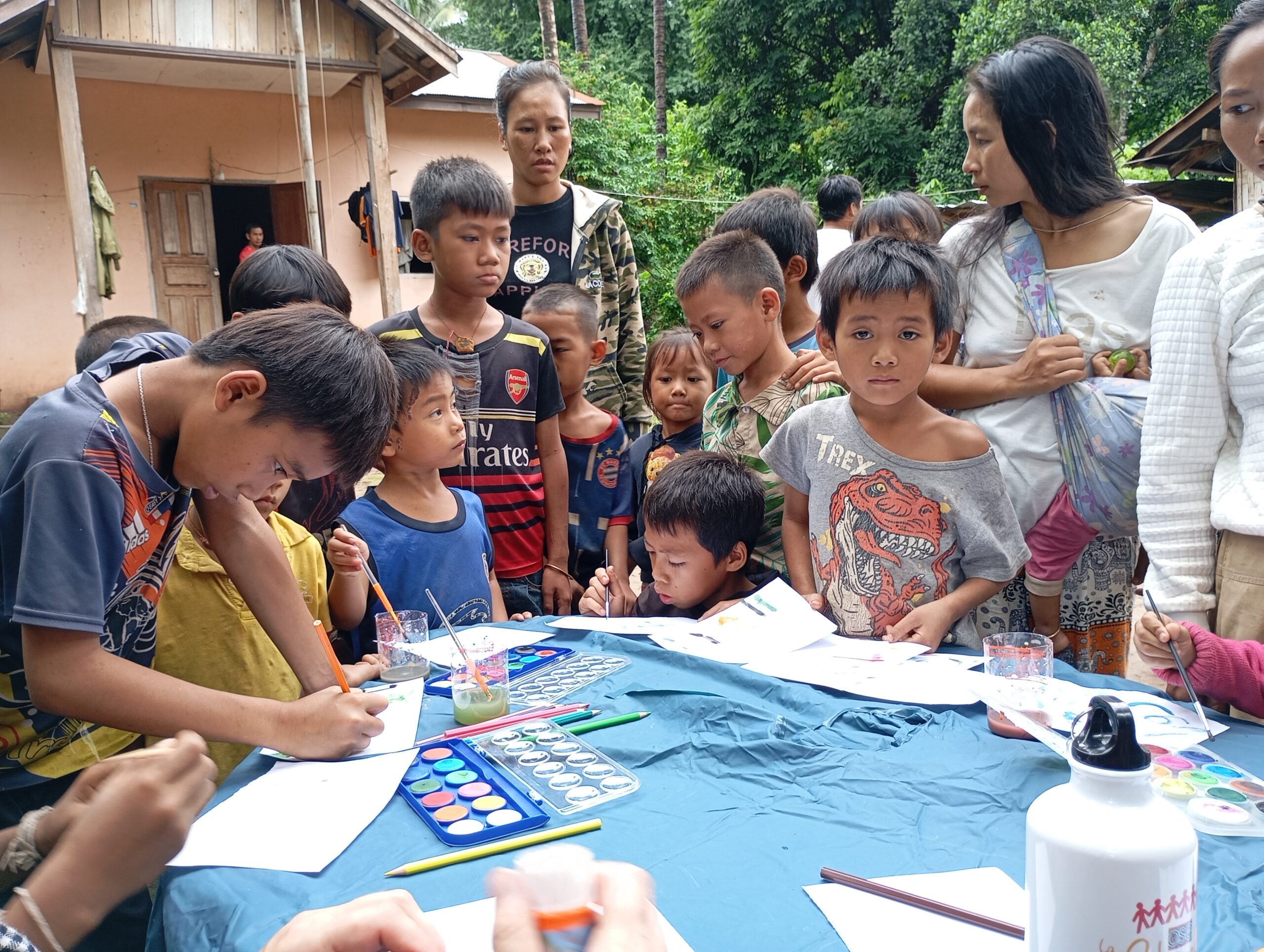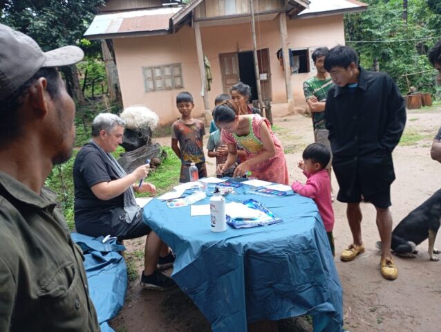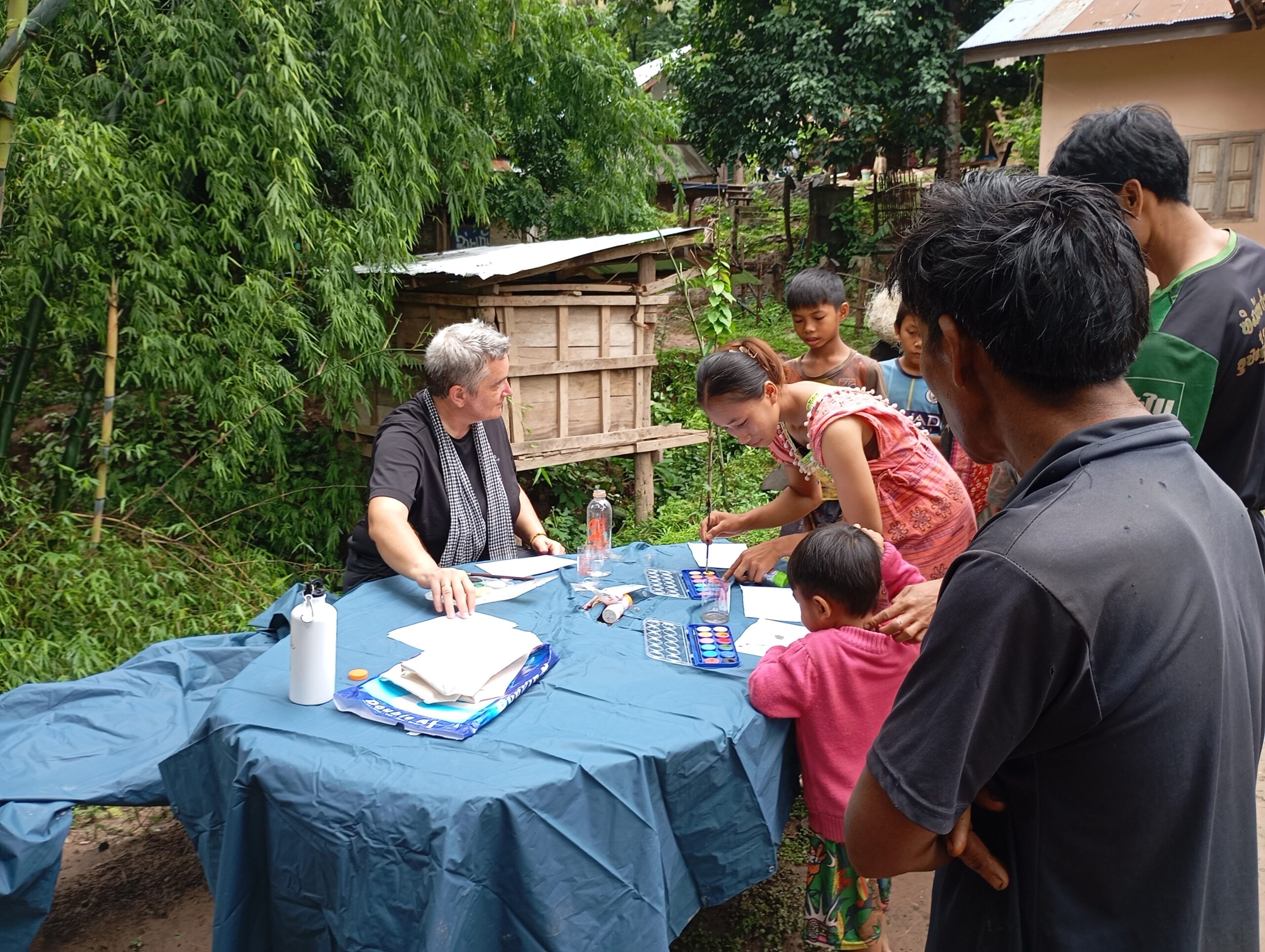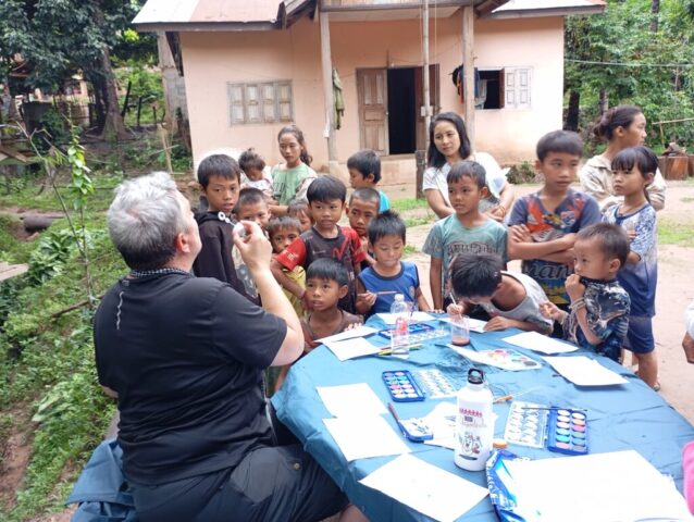 Nous prenons le speed Boat avec les médecins de l’association « Médecins de Pakbeng » pour nous rendre dans un village isolé « Done Cheng ». Pendant que les adultes patientent pour une consultation, nous improvisons un atelier peinture avec les enfants. Le bouche à oreilles fonctionne bien, en quelques minutes une vingtaine d’enfants nous entourent. Nous passerons la journée dans ce village.