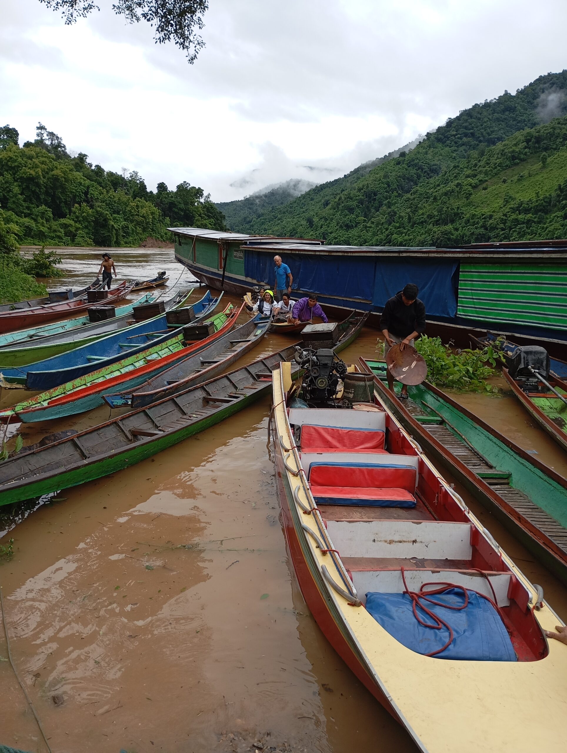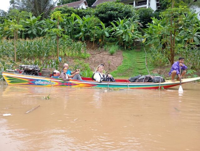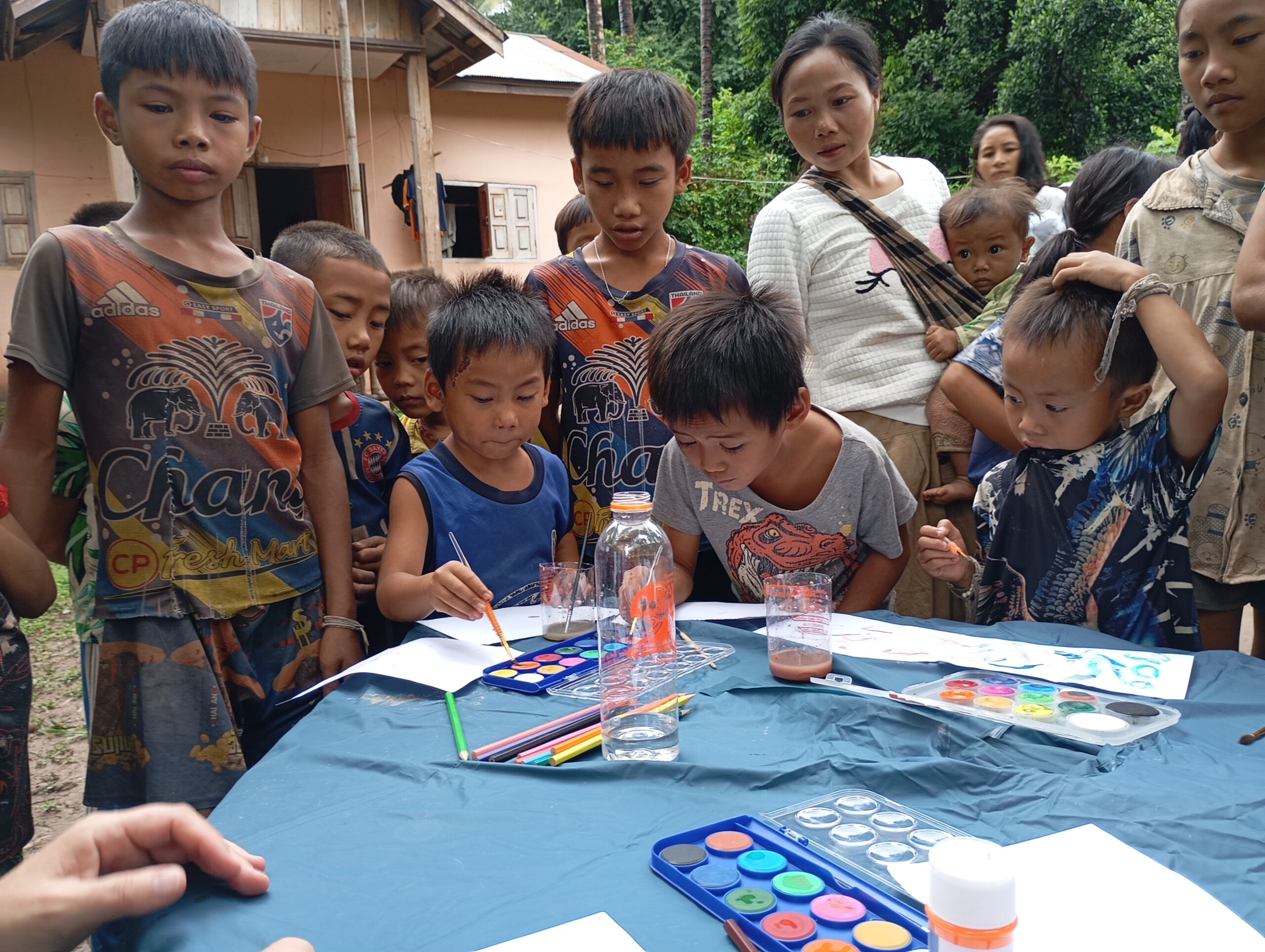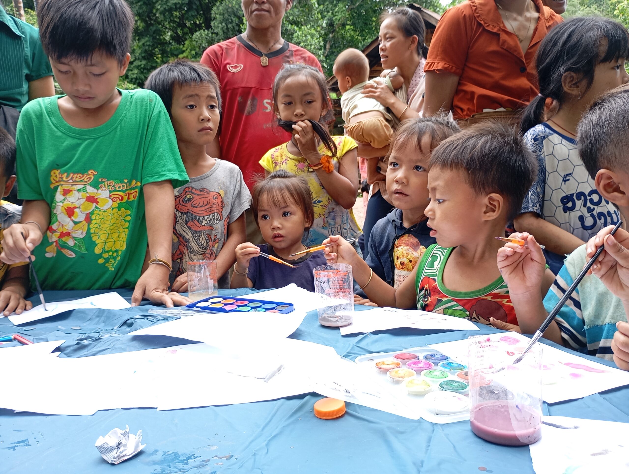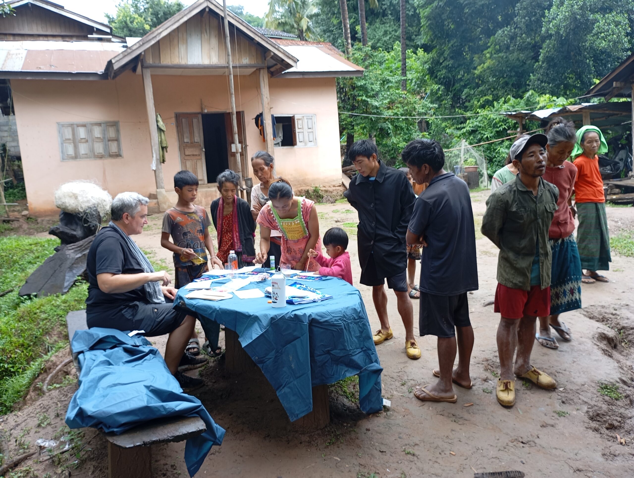 Nous prenons le speed Boat avec les médecins de l’association « Médecins de Pakbeng » pour nous rendre dans un village isolé « Done Cheng ». Pendant que les adultes patientent pour une consultation, nous improvisons un atelier peinture avec les enfants. Le bouche à oreilles fonctionne bien, en quelques minutes une vingtaine d’enfants nous entourent. Nous passerons la journée dans ce village.