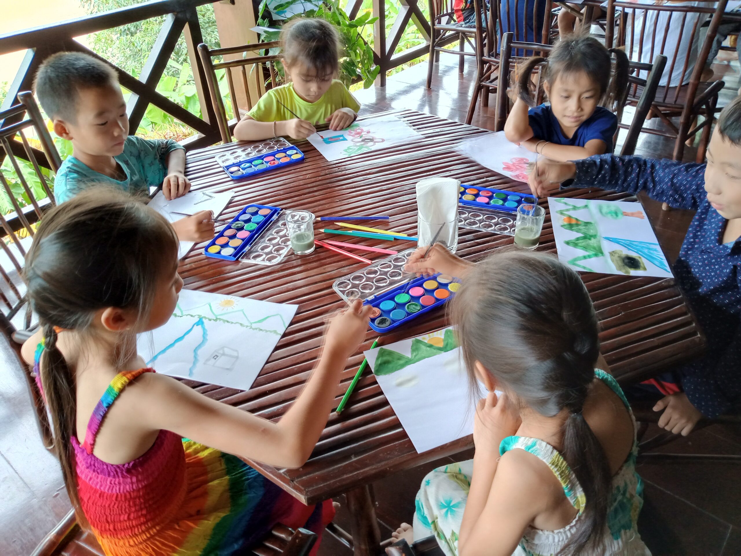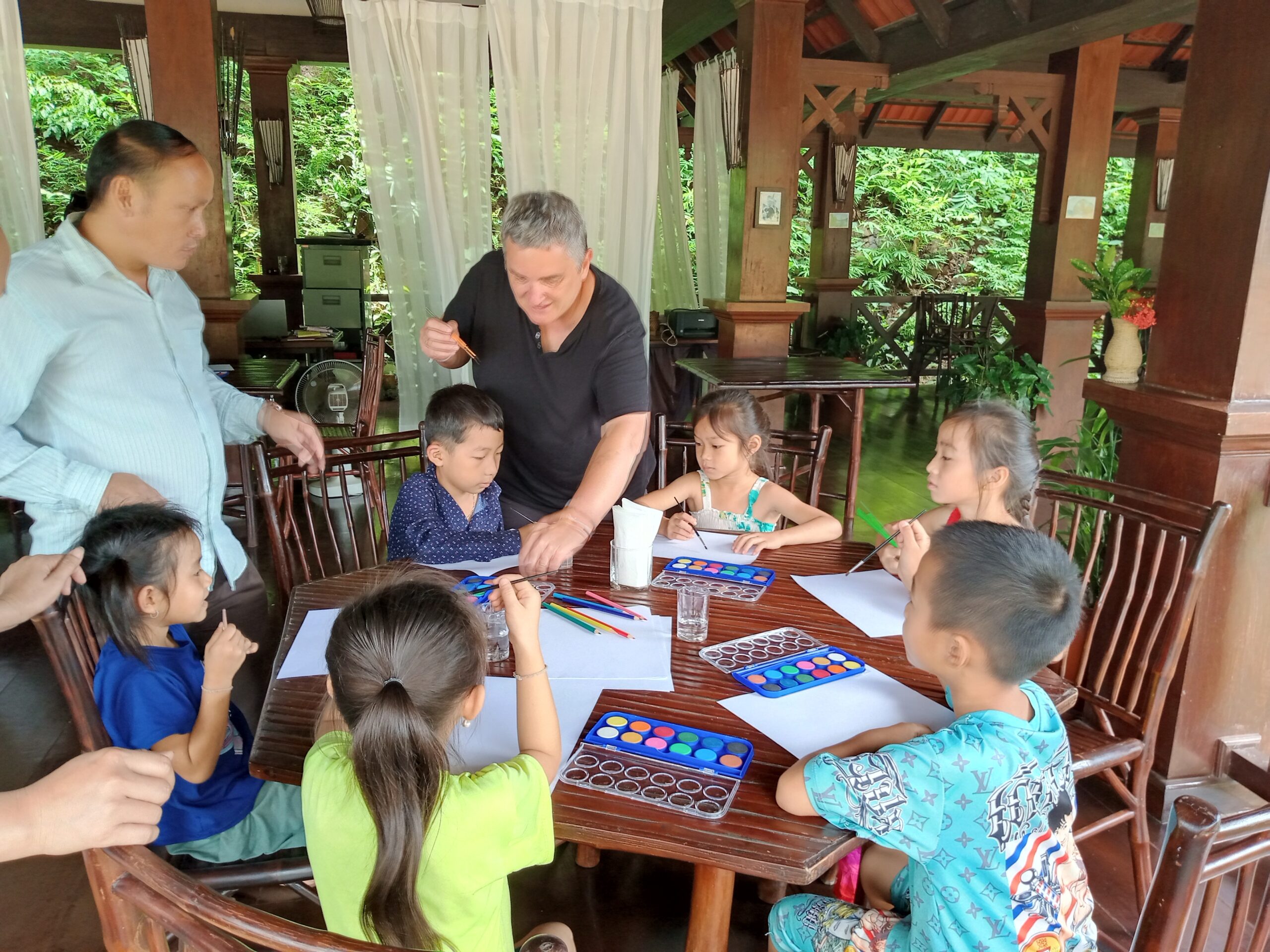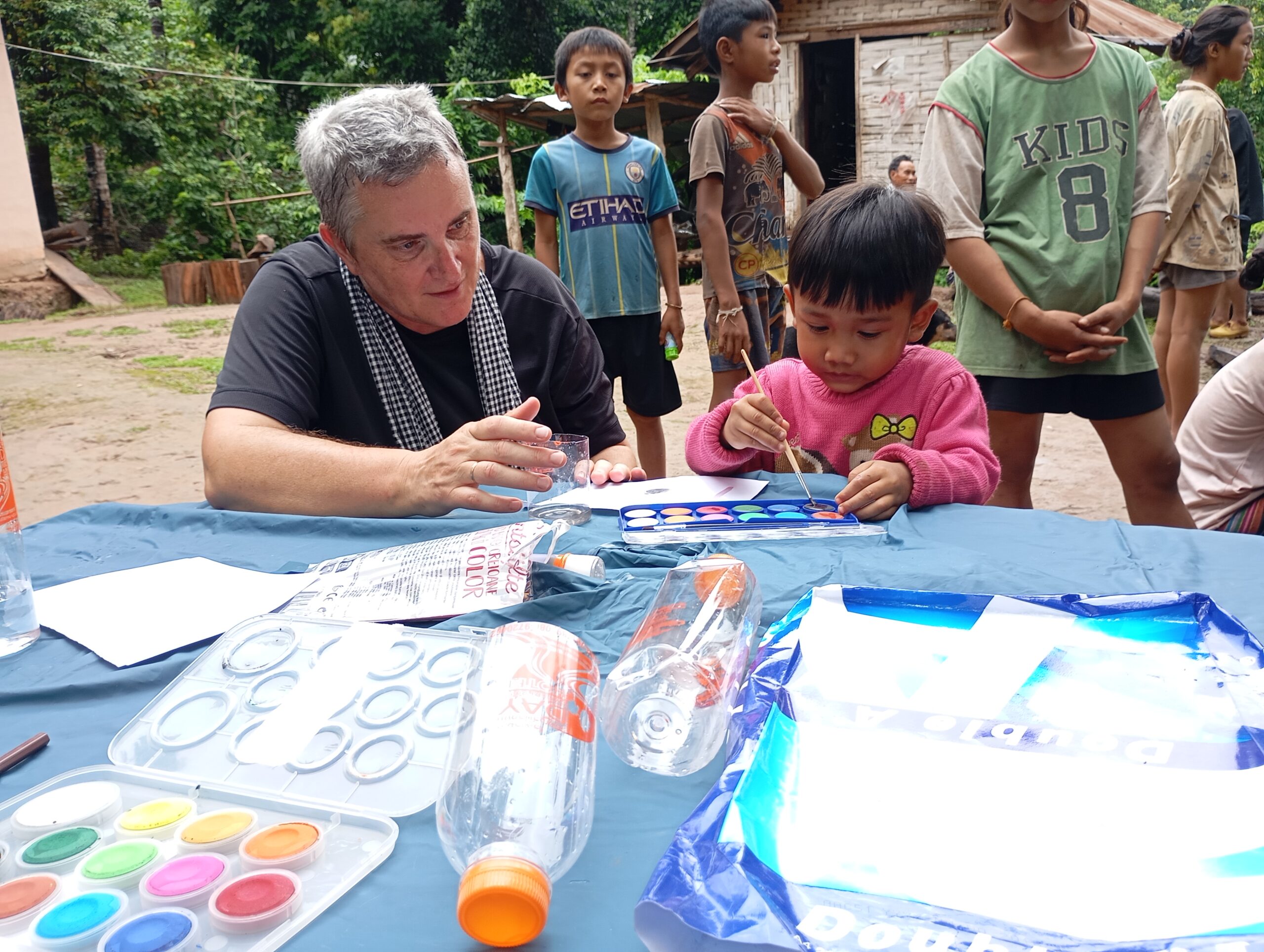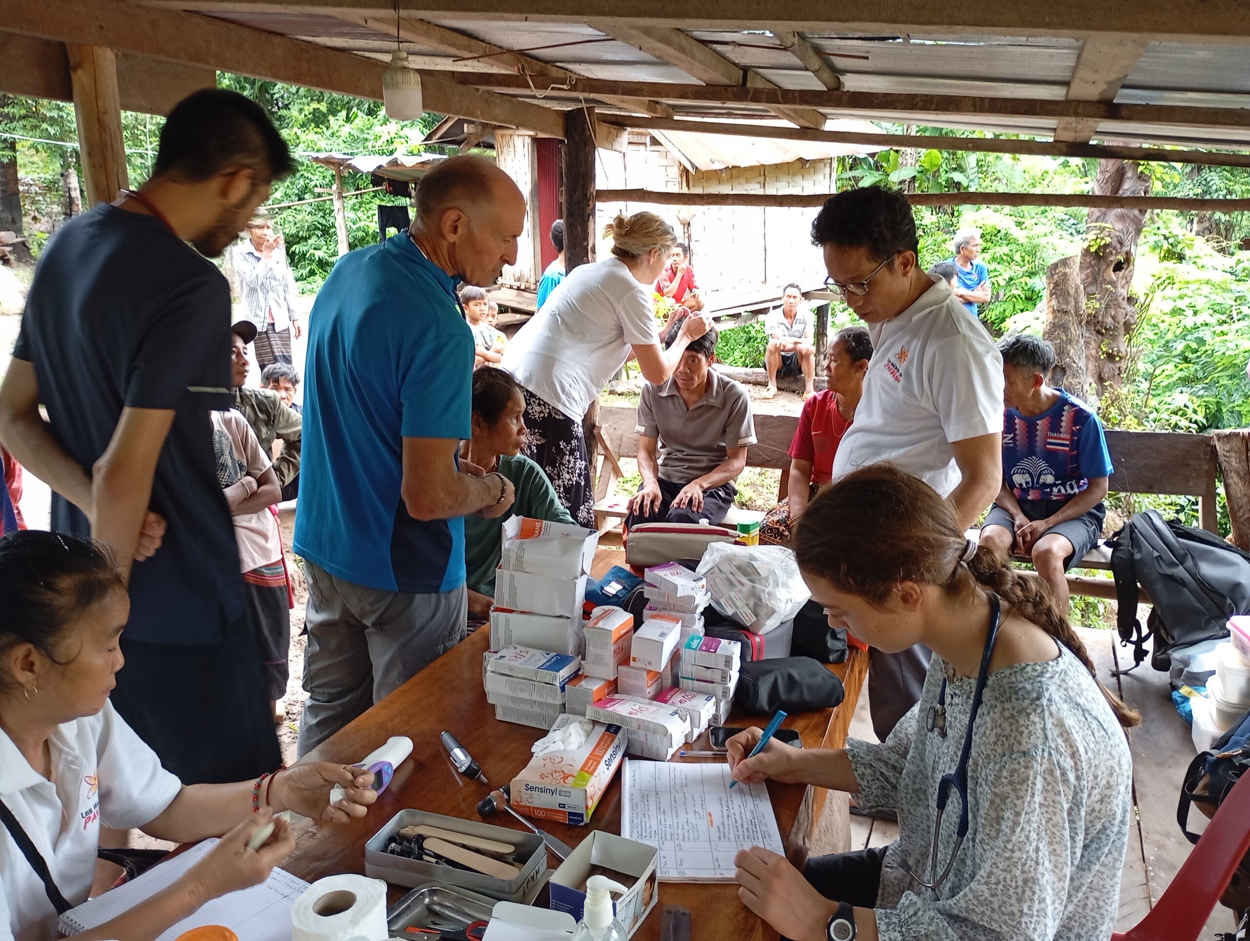 Nous prenons le speed Boat avec les médecins de l’association « Médecins de Pakbeng » pour nous rendre dans un village isolé « Done Cheng ». Pendant que les adultes patientent pour une consultation, nous improvisons un atelier peinture avec les enfants. Le bouche à oreilles fonctionne bien, en quelques minutes une vingtaine d’enfants nous entourent. Nous passerons la journée dans ce village.