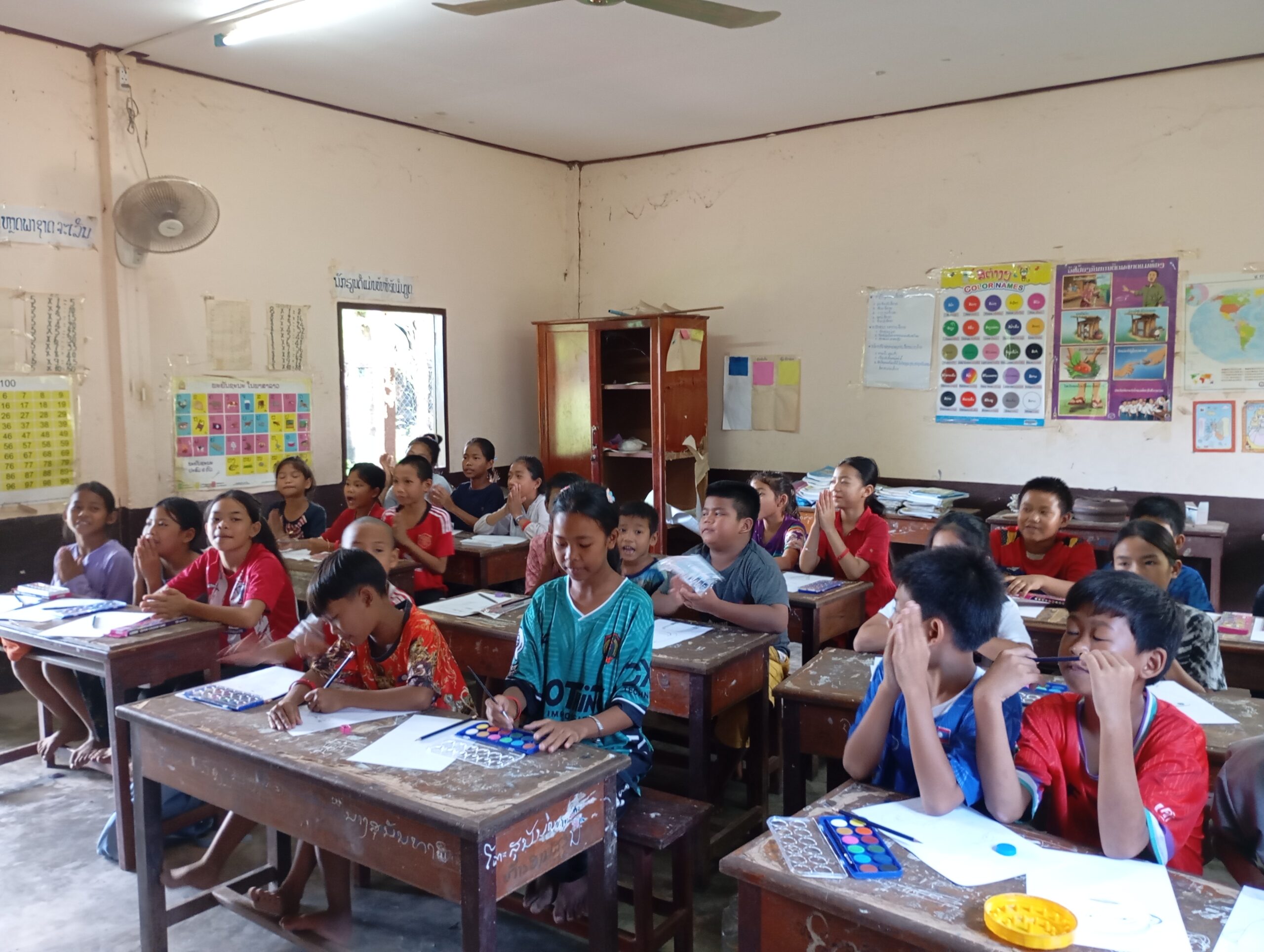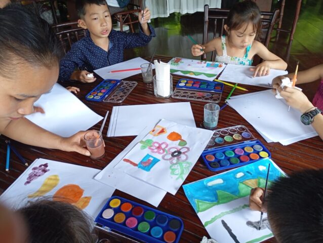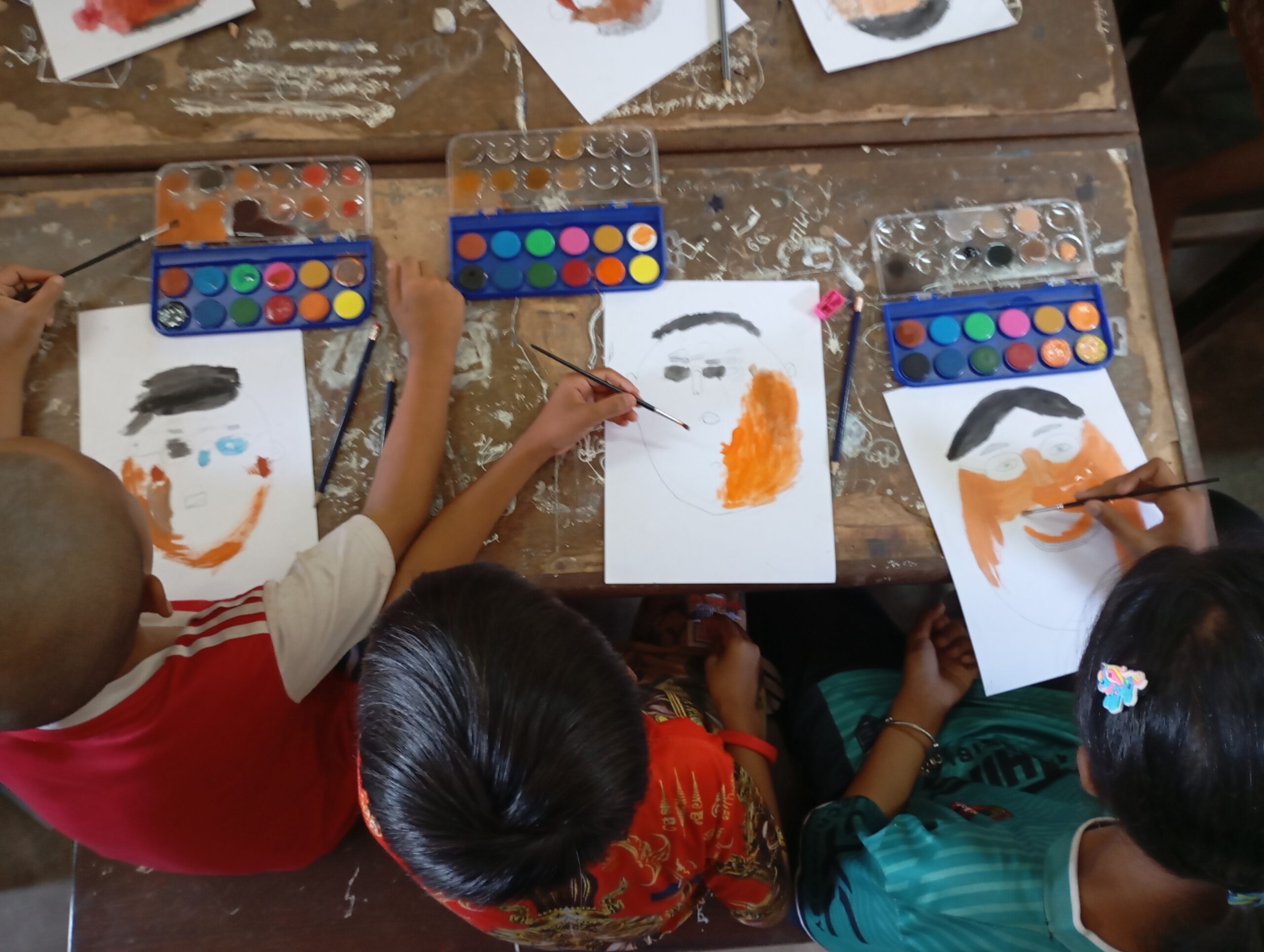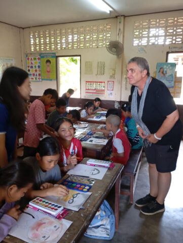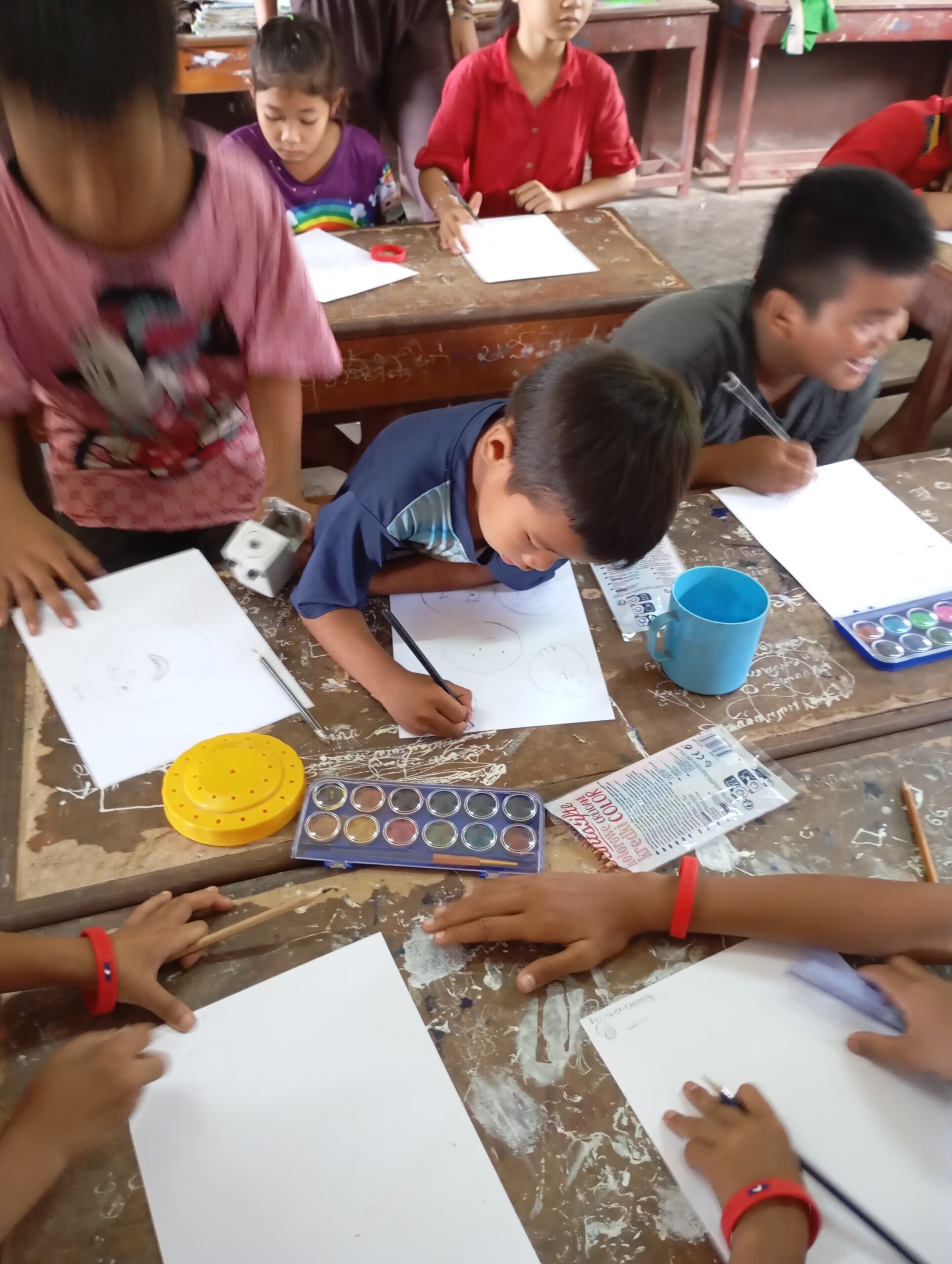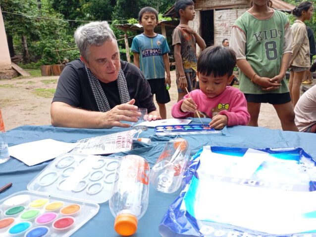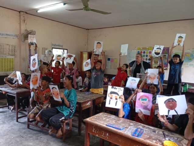 Une école du quartier nous a ouvert ses pportes pour permettre à une trentaine d’enfants suivis par Enfants d’Asie de bénéficier d’une matinée peinture. Calou co-anime l’atelier avec Touk qui travaille pour l’ONG mais qui est également artiste. Calou s’improvise modèle pour un travail sur les émotions.