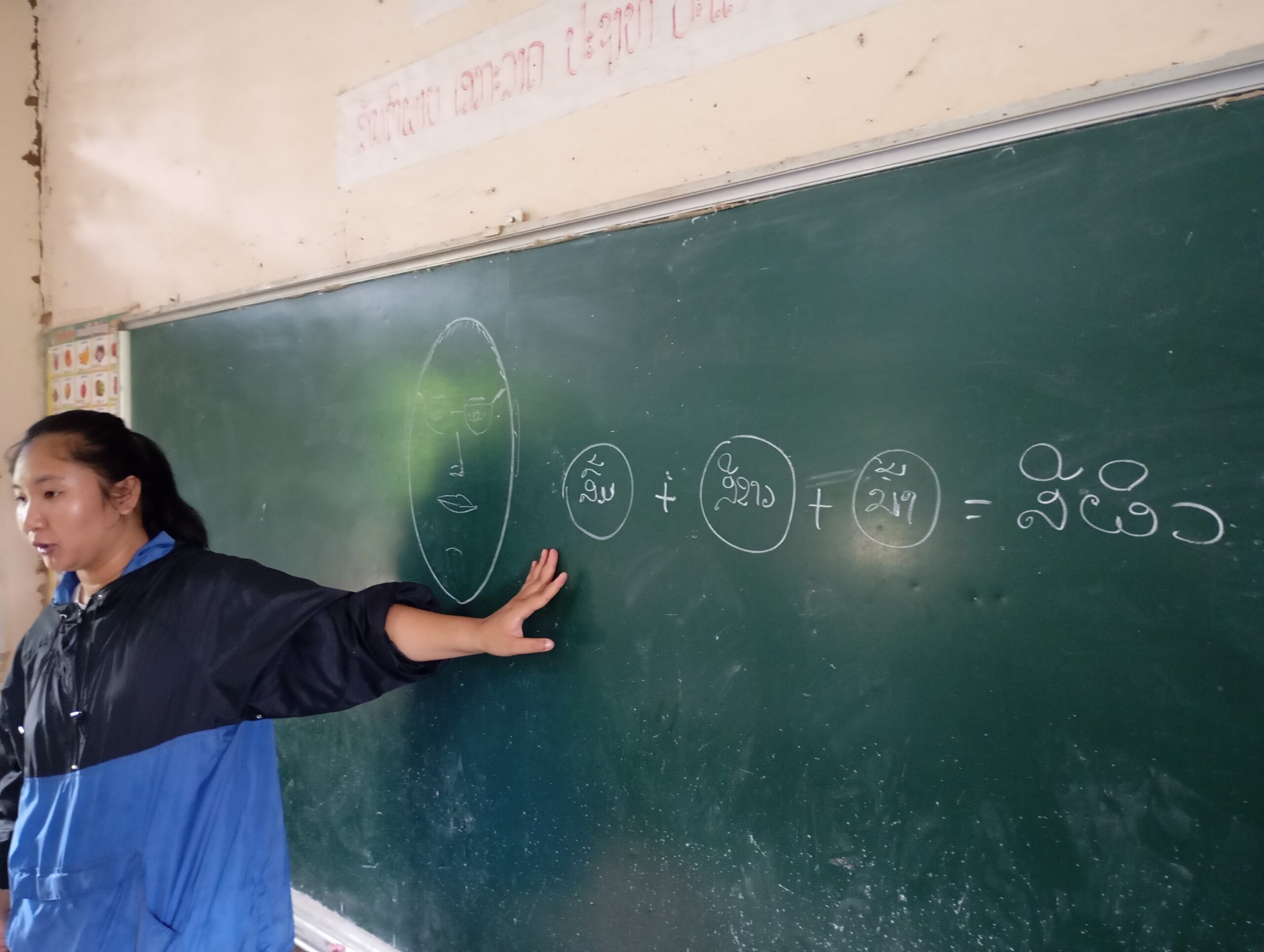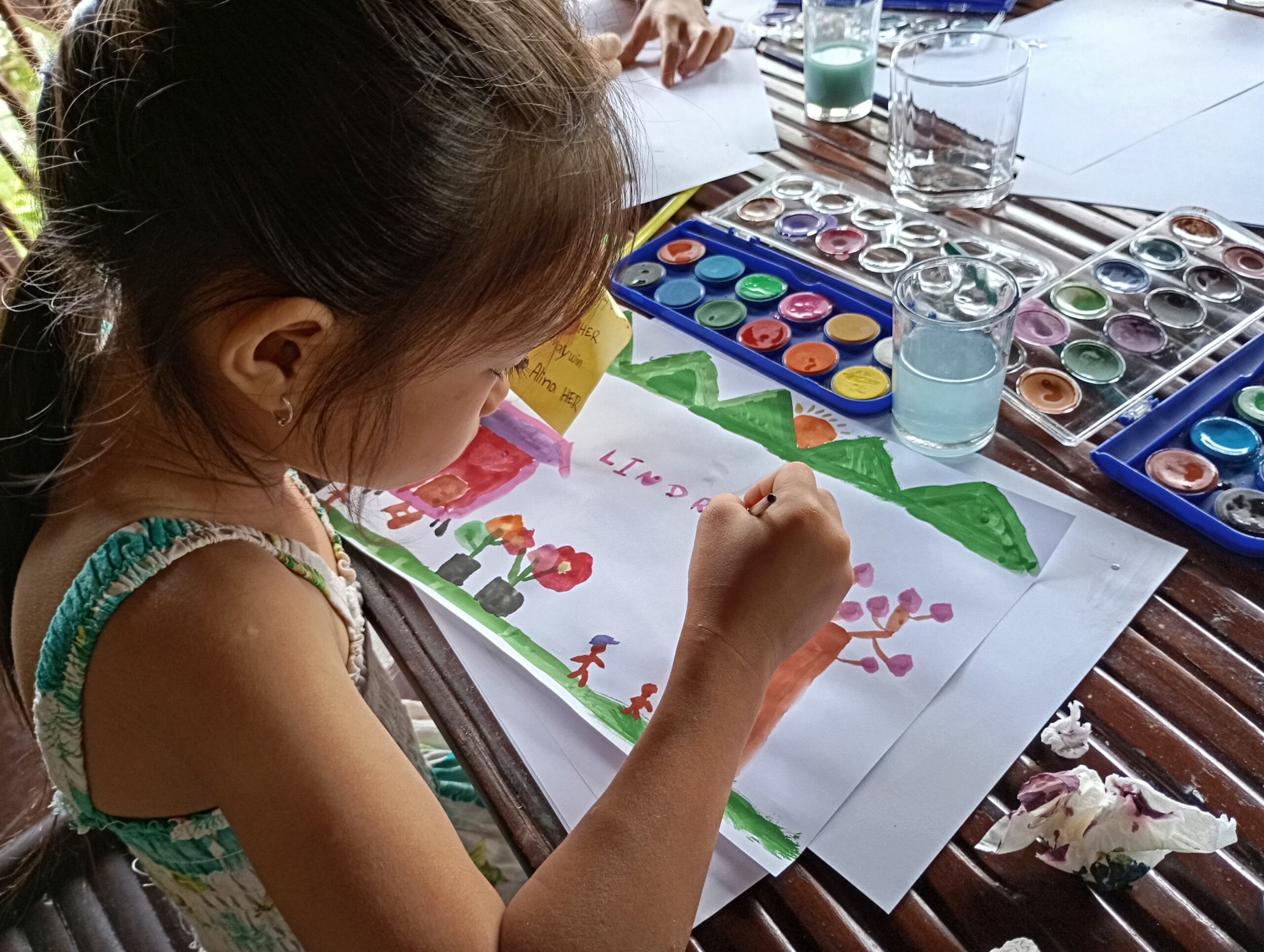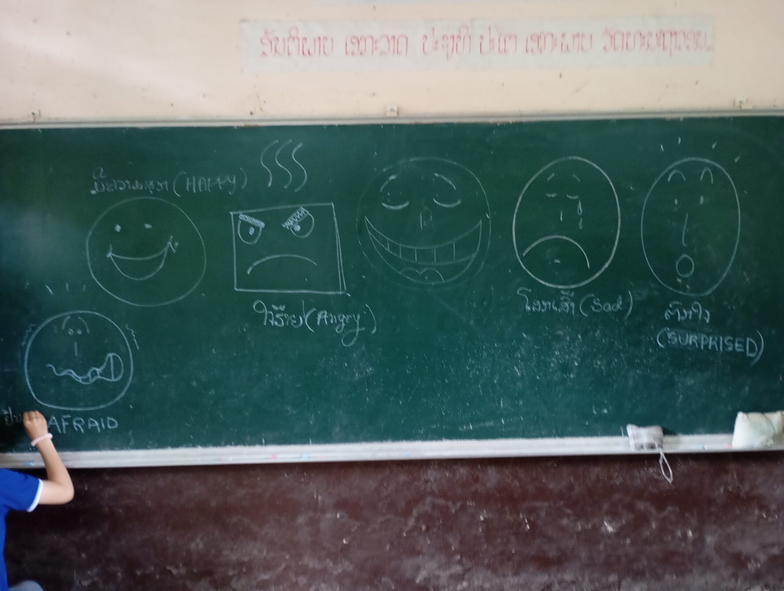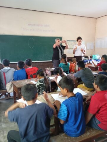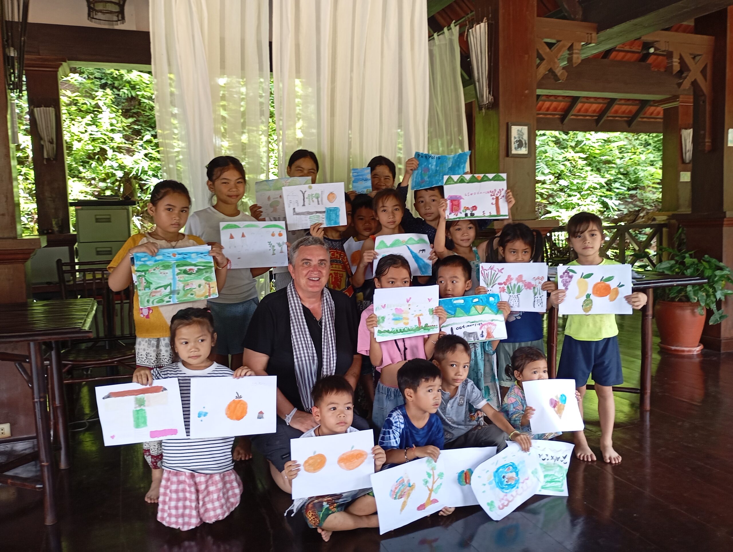 Une école du quartier nous a ouvert ses pportes pour permettre à une trentaine d’enfants suivis par Enfants d’Asie de bénéficier d’une matinée peinture. Calou co-anime l’atelier avec Touk qui travaille pour l’ONG mais qui est également artiste. Calou s’improvise modèle pour un travail sur les émotions.